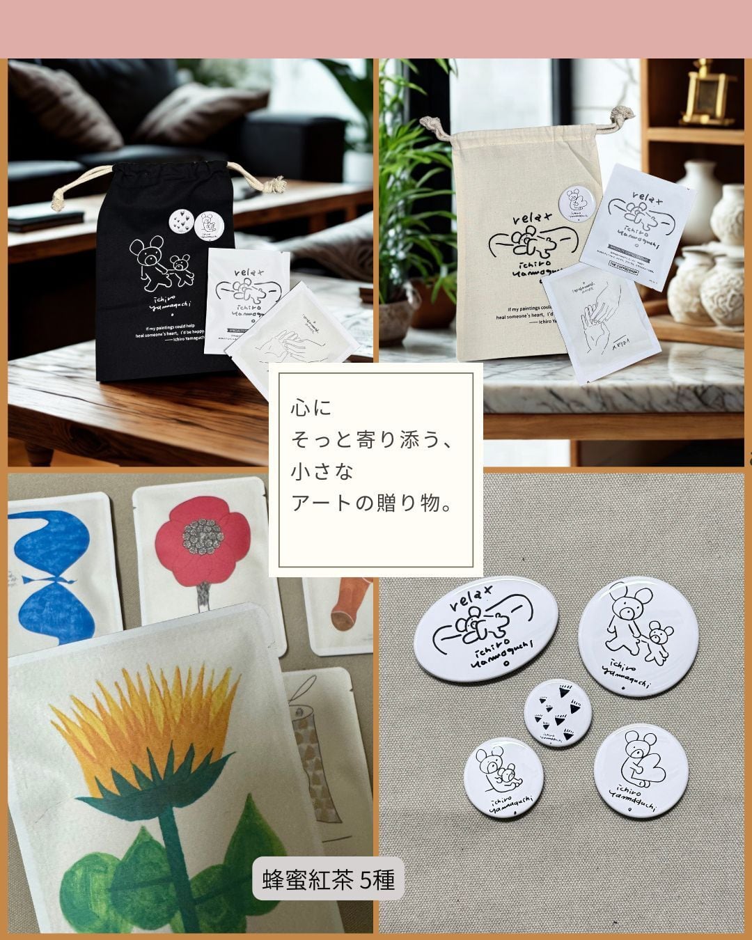 香る、一杯。とろけるこころ。 はちみつのやさしい甘さと紅茶の香りを楽しめる「蜂蜜紅茶」を、5種類のフレーバーで詰め合わせました。 その日の気分やシーンに合わせて、すっきり・ほっと一息・じんわり温まりたい時など、いろいろな味わいを選んでいただけます。 おうち時間のおともにはもちろん、職場での休憩タイムや、ちょっとしたギフトにもぴったりです。 山口一郎氏の原画をそのまま袋にプリントした、飲み終わってもポストカードのように飾れる癒しのアートギフト。 【フレーバー(5種)】 はちみつ(テディベア) 定番のやさしい甘さ。まずは一杯目に飲んでほしいベーシックフレーバー。 瀬戸内れもんと蜂蜜(ひまわり) 広島県産レモンとハーブをブレンドした爽やかな蜂蜜紅茶です。 蜜りんごと蜂蜜紅茶(赤い花) りんごの香りに癒される一番人気の蜂蜜紅茶です。 生姜と蜂蜜(フクロウ) 高知県産の生姜チップがたっぷり入った、からだの内側からぽかぽか温まる一杯。 蜂蜜とるいぼす(ブルーバード) カフェインが気になる方にうれしいルイボスベース。夜のリラックスタイムにも。 【おいしい淹れ方】 カップにティーバッグを1包入れます。 沸騰したお湯(約150〜180ml)を注ぎ、3分蒸らしてください。 お好みの濃さになったらティーバッグを取り出してお召し上がりください。 ※ミルクを少し加えたり、さらに追いはちみつをしても、デザート感が増しておすすめです。 内容量:ティーバッグ 2g×2包(4g) 形態:ティーバッグ 賞味期限:2027年5月 高温多湿を避けて移り香に注意して常温で保存してください。 可愛いパッケージにどのフレーバーにしようか選ぶ楽しさもセットになった蜂蜜紅茶です。自分へのごほうびはもちろん、「お疲れさま」「ありがとう」を伝えたいときのプチギフトとしてもどうぞ。