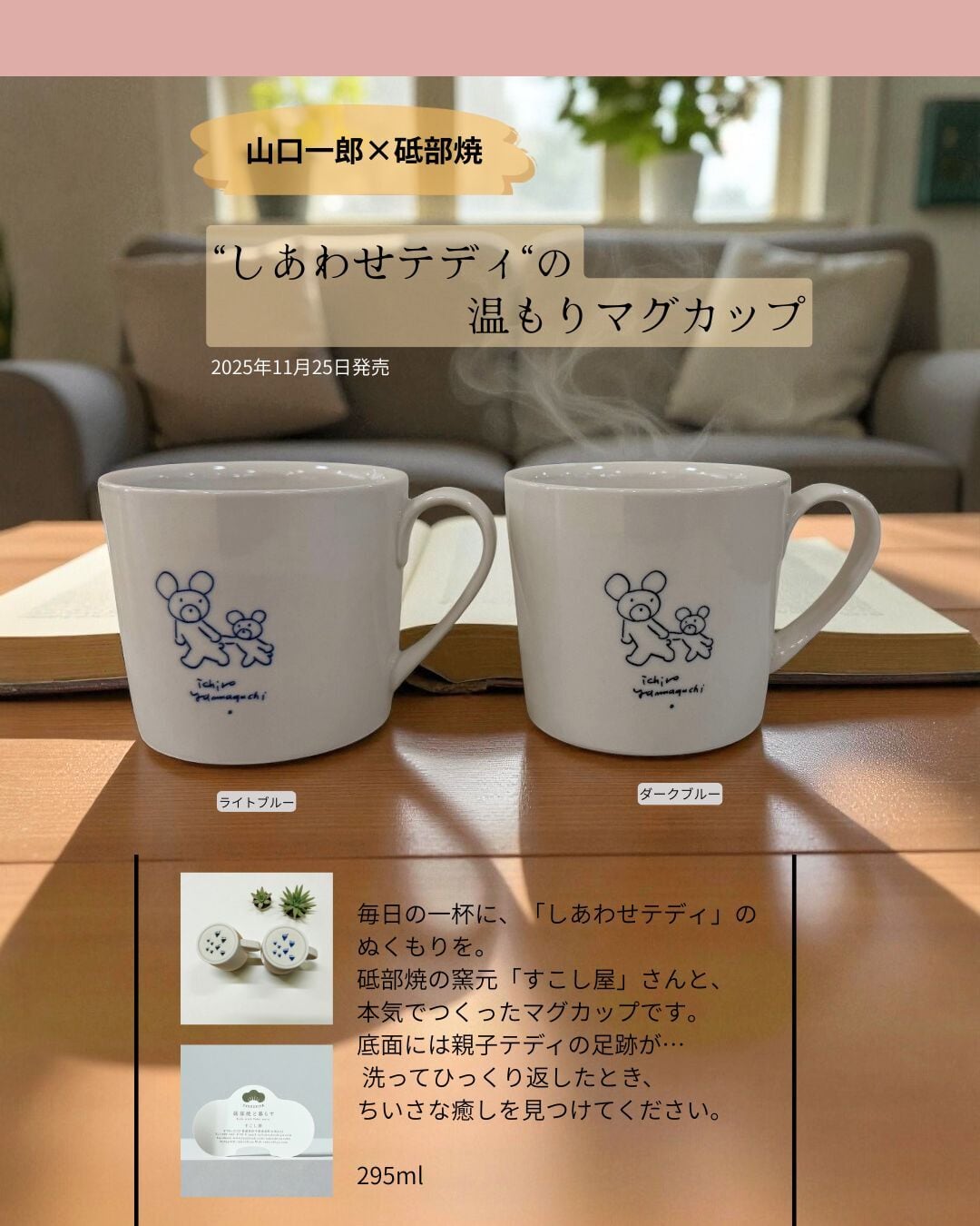 愛媛県砥部焼の窯元「すこし屋」さんと、本格的なマグカップをつくりました。柔らかな乳白色の生地に、画家・山口一郎さんのやさしい親子テディがおさんぽ。日常の一杯に、そっと寄り添ってくれるマグです。