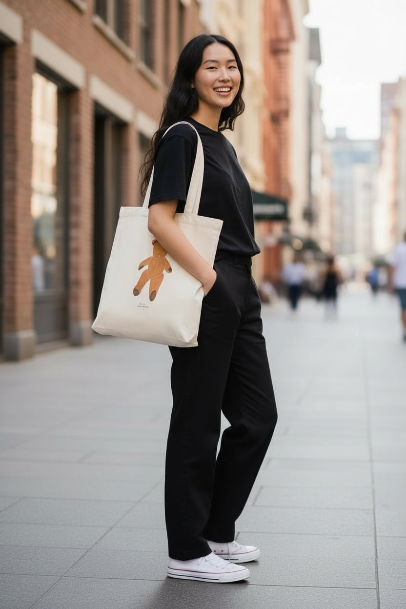 フラット(マチなし)でスッキリ、持ち手は長めで肩掛けも可能。B4サイズがゆったり入るので、書類や教材の持ち運びにも頼れます。